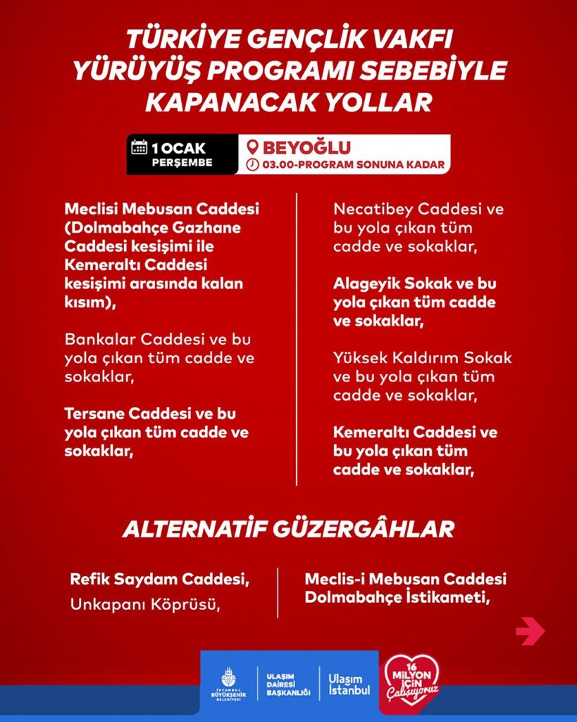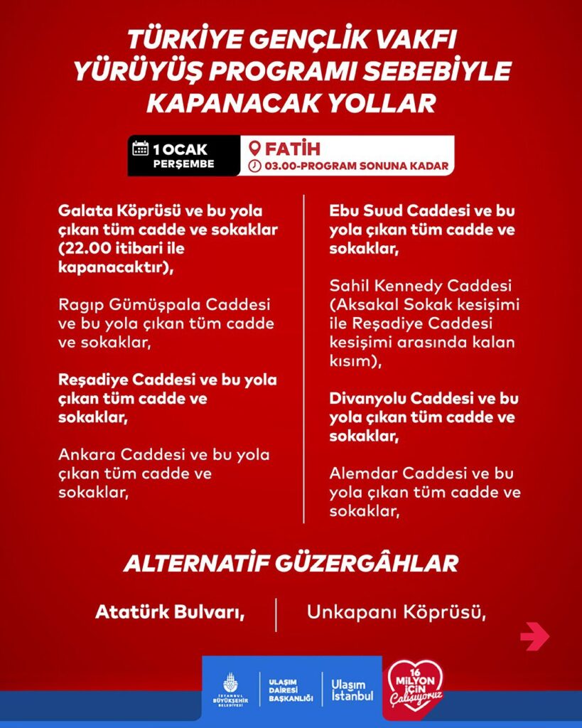 İETT tarafından yapılan açıklamaya göre, 1 Ocak 2026 Perşembe günü düzenlenecek Tügva mitingi nedeniyle Galata Köprüsü, gece 04.00 – 14.00 saatleri arasında trafiğe kapatılacaktır. Bu nedenle bazı otobüs hatlarında geçici güzergâh değişiklikleri uygulanacaktır.