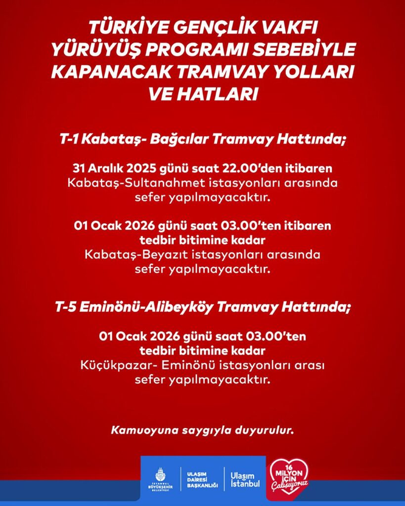 T1 Kabataş-Bağcılar Hattı: Kabataş-Beyazıt istasyonları arasında sefer yapılamayacak.