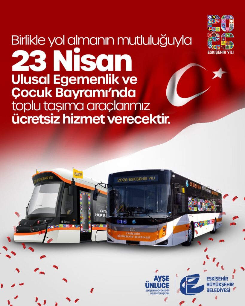 Eskişehir Büyükşehir Belediyesi tarafından yapılan duyuruya göre, 23 Nisan Ulusal Egemenlik ve Çocuk Bayramı kutlamaları kapsamında şehir içi toplu taşıma hizmetleri gün boyu ücretsiz olarak sağlanacaktır.
