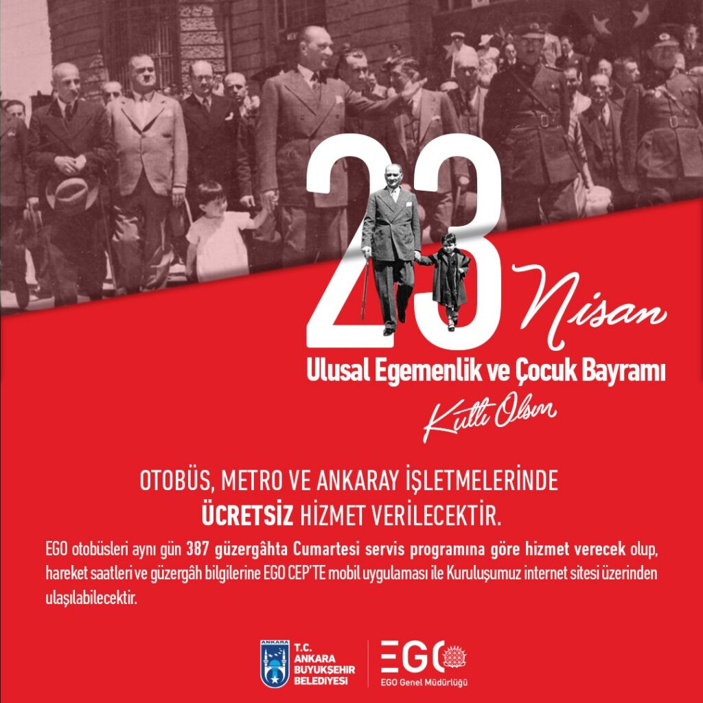 23 Nisan Ulusal Egemenlik ve Çocuk Bayramı kutlamaları kapsamında, EGO Genel Müdürlüğü tarafından sağlanan toplu taşıma hizmetleri Ankara’da gün boyu ücretsiz olarak gerçekleştirilecektir.