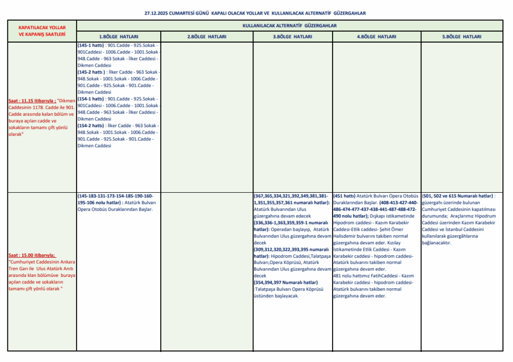 🗓 27 Aralık 2025 Cumartesi – Trafik Düzenlemeleri