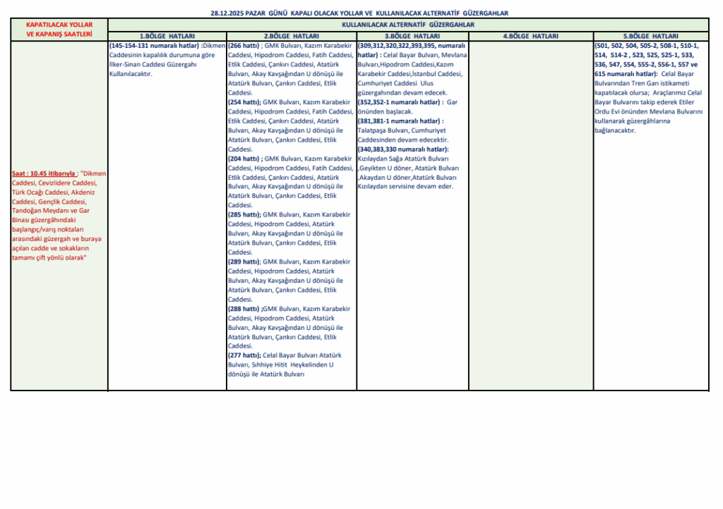 🗓 28 Aralık 2025 Pazar – Trafik Düzenlemeleri