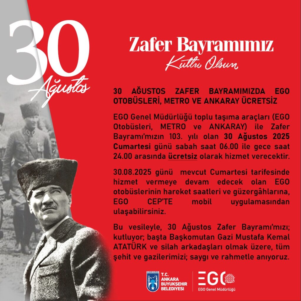 📌 Ayrıca, Zafer Bayramı’nın 103. yılı dolayısıyla 30 Ağustos Cumartesi günü EGO otobüsleri, Metro ve ANKARAY 06.00 – 23.59 saatleri arasında ücretsiz ulaşım hizmeti verecek. EGO otobüsleri mevcut Cumartesi tarifesine göre çalışmaya devam edecek.