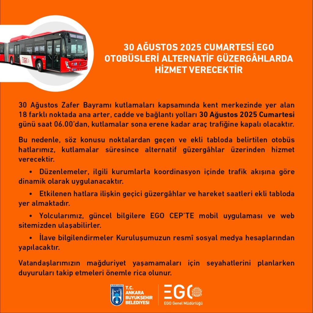 📌 30 Ağustos 2025 Cumartesi günü sabah saat 06.00’dan itibaren, kutlamalar sona erene kadar kent merkezindeki 18 farklı noktada ana arter, cadde ve bağlantı yolları araç trafiğine kapalı olacak. Bu nedenle söz konusu bölgelerden geçen ve duyuruda belirtilen EGO otobüs hatları, gün boyunca alternatif güzergâhlardan hizmet verecek. Düzenlemelerin ilgili kurumlarla koordinasyon içinde, trafik akışına bağlı olarak dinamik şekilde uygulanacağı bildirildi.