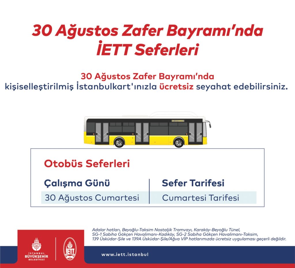 İETT Otobüsleri: 30 Ağustos Cumartesi günü Cumartesi tarifesi uygulanacak.