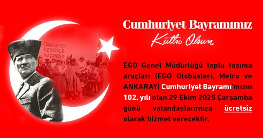 Cumhuriyet Bayramı’nın 102. yılı kapsamında, 29 Ekim 2025 Çarşamba günü EGO otobüsleri, Metro ve ANKARAY gün boyu ücretsiz hizmet verecektir.