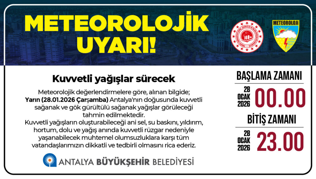 🌧️ Meteoroloji Genel Müdürlüğü’nün değerlendirmelerine göre, 28 Ocak 2026 Çarşamba günü Antalya’nın doğu kesimlerinde kuvvetli sağanak ve gök gürültülü sağanak yağış beklenmektedir.