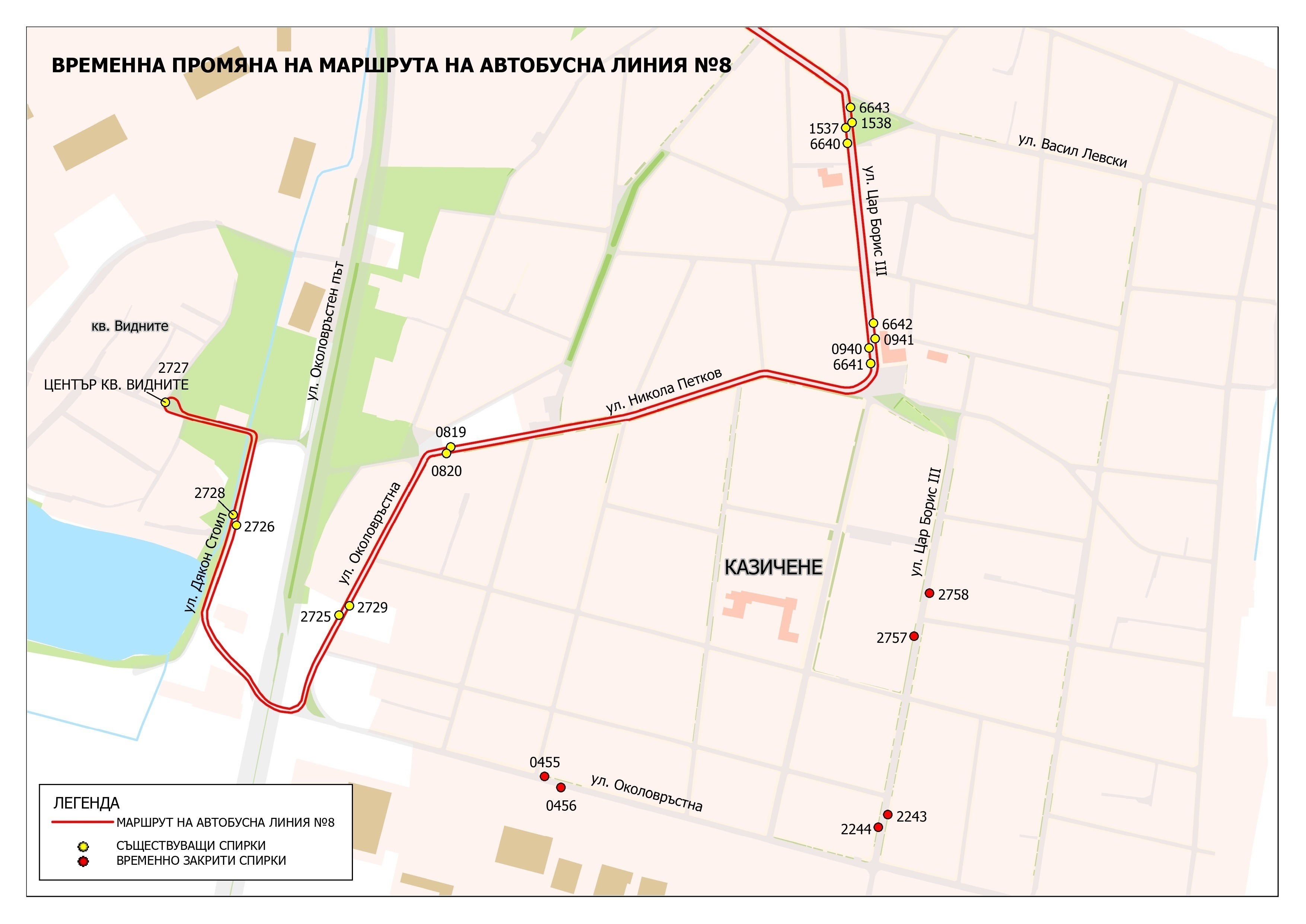 Считано от 06:00 ч. на 19.09.2025 г. до 12:00 ч. на 22.09.2025 г. се променя частично маршрута на автобусна линия № 8 както следва:
