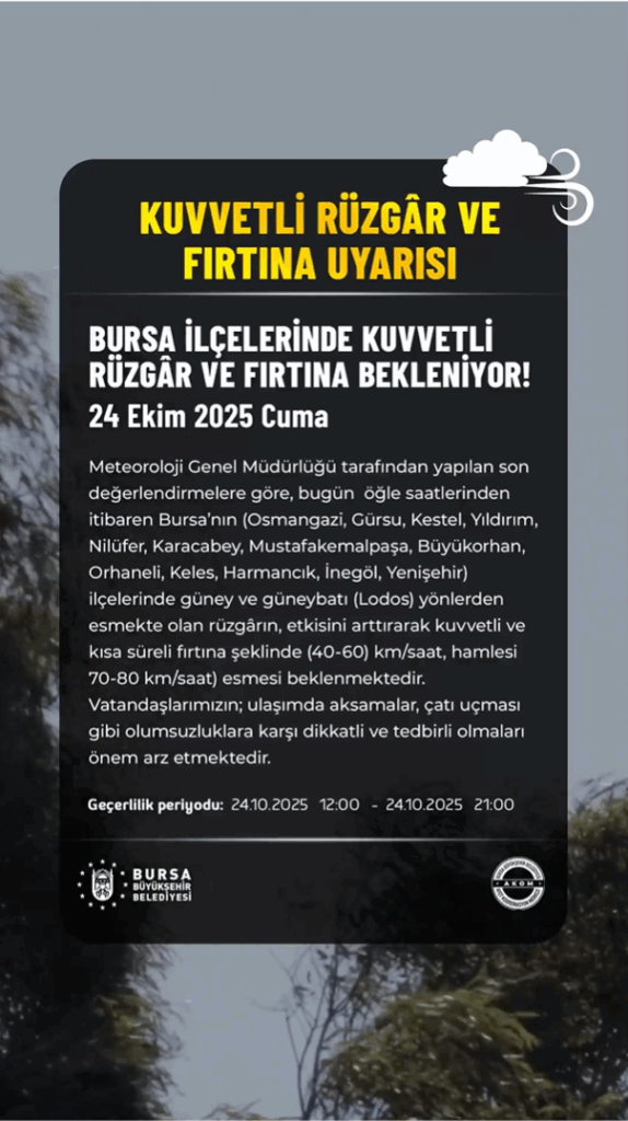Bursa Büyükşehir Belediyesi’nin açıklamasına göre, 24 Ekim 2025 Cuma günü Bursa genelinde kuvvetli sağanak yağış ve fırtına bekleniyor.