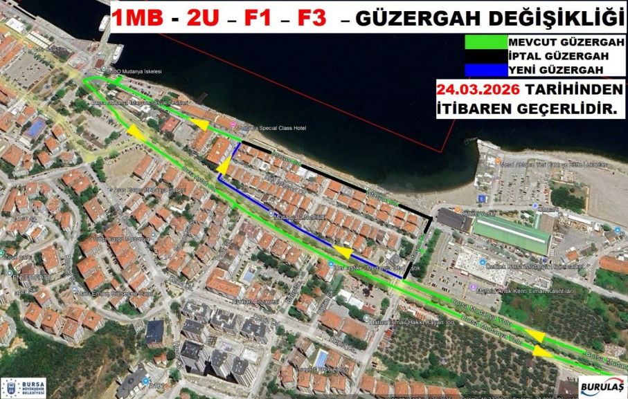 Bursa Büyükşehir Belediyesi (BURULAŞ) tarafından yapılan güncel ulaşım planlamaları doğrultusunda, Mudanya bölgesinde hizmet veren 1MB, 2U, F1 ve F3 numaralı otobüs hatlarının rotalarında değişikliğe gidilmiştir.