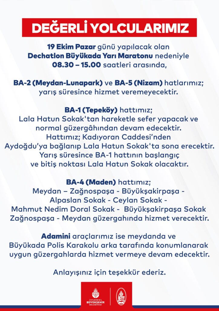 19 Ekim Pazar günü düzenlenecek Decathlon Büyükada Yarı Maratonu nedeniyle, 08.30–15.00 saatleri arasında bazı hatlarda geçici düzenlemeler yapılacak.