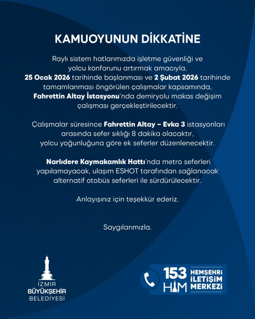 ⏱️ Bu süre boyunca Fahrettin Altay – Evka 3 istasyonları arasında metro seferleri 8 dakika aralıklarla yapılacak, yolcu yoğunluğuna göre ek seferler düzenlenebilecektir.