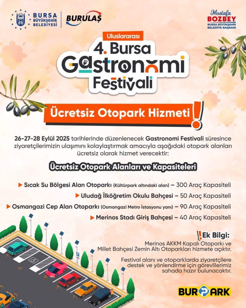 Özel araçlarıyla gelecek ziyaretçiler için de Sıcak Su Bölgesi Otoparkı (300 araç), Uludağ İlköğretim Okulu Bahçesi (50 araç), Osmangazi Cep Alanı (90 araç) ve Merinos Stadı Giriş Bahçesi (40 araç) ücretsiz olarak kullanılabilecek.