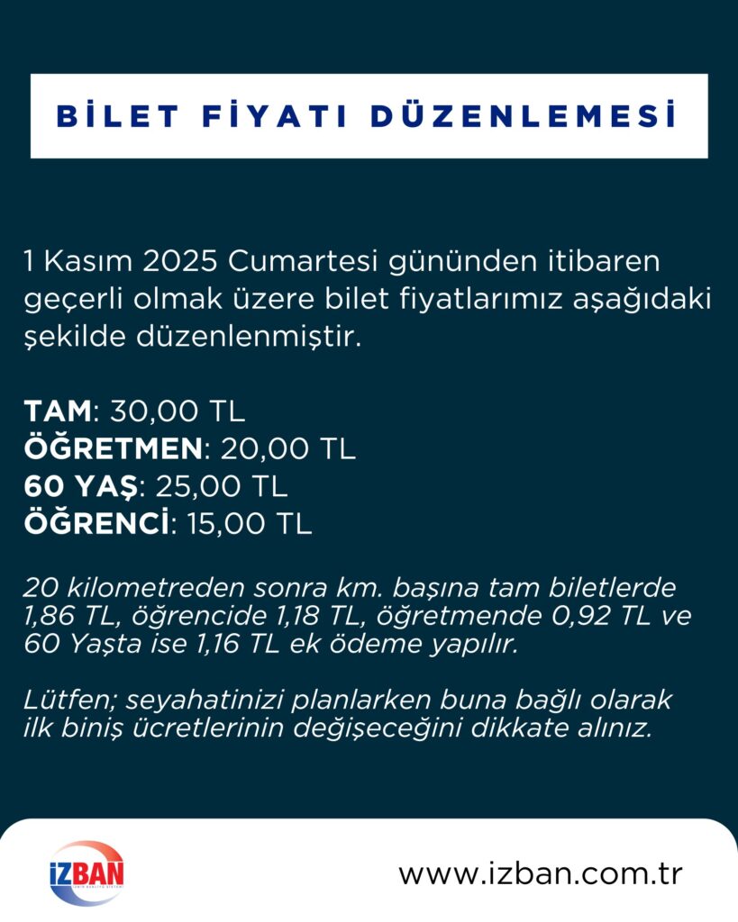 İZBAN’ın duyurusuna göre, 1 Kasım 2025 Cumartesi gününden itibaren İZBAN bilet fiyatları güncellenmiştir. Yeni ücretler şu şekilde: