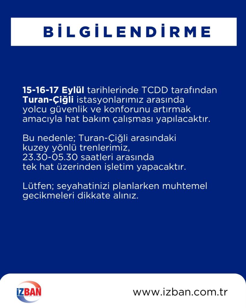 İZBAN, yolcu güvenliği ve konforunu artırmak amacıyla Turan – Çiğli istasyonları arasında hat bakım çalışması yapılacağını açıkladı.