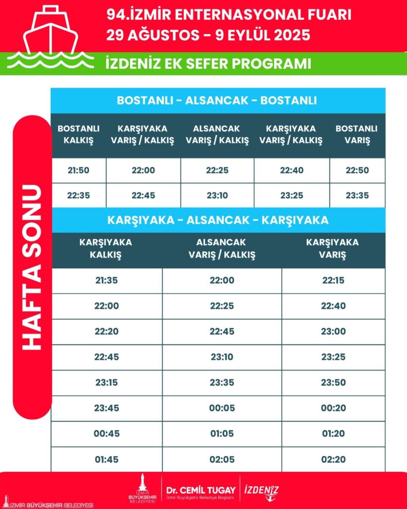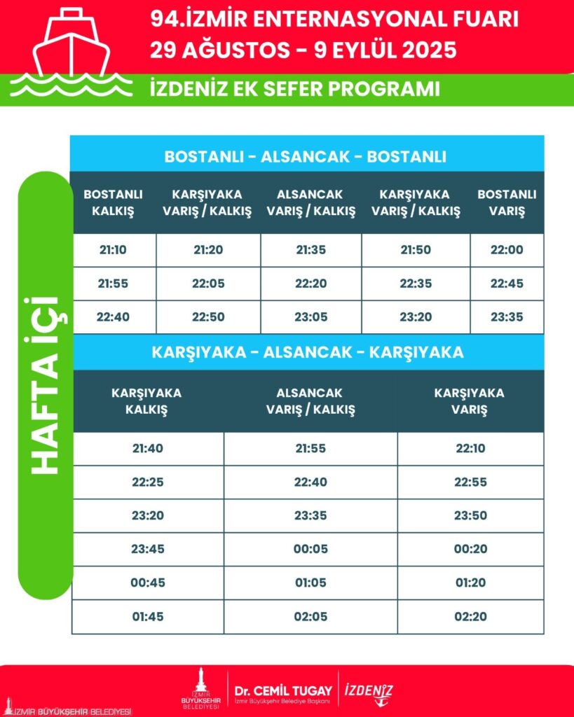 🚊 İZBAN, fuar süresince her gün Aliağa ve Tepeköy yönlerinden iki ek sefer koyacak. Trenler Aliağa’dan 00.26, Tepeköy’den 00.31’de hareket edecek ve her iki yöndeki trenler saat 01.35’te Alsancak’tan geri dönecek.