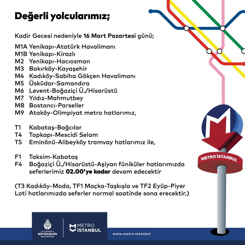 Kadir Gecesi dolayısıyla, 16 Mart Pazartesi gününü 17 Mart Salı gününe bağlayan gece, İstanbul’daki raylı sistem hatlarında sefer süreleri saat 02.00’ye kadar uzatılmıştır.