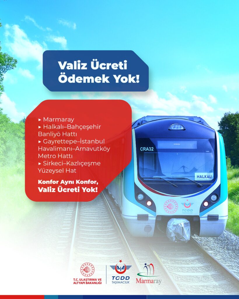 📢 Öte yandan, TCDD Taşımacılık A.Ş., kendisine bağlı Marmaray, Halkalı – Bahçeşehir Banliyö Hattı, Gayrettepe – İstanbul Havalimanı – Arnavutköy Metro Hattı ve Sirkeci – Kazlıçeşme Yüzeysel Hat gibi hatlarda valizlerden ek ücret alınmadığını duyurdu.