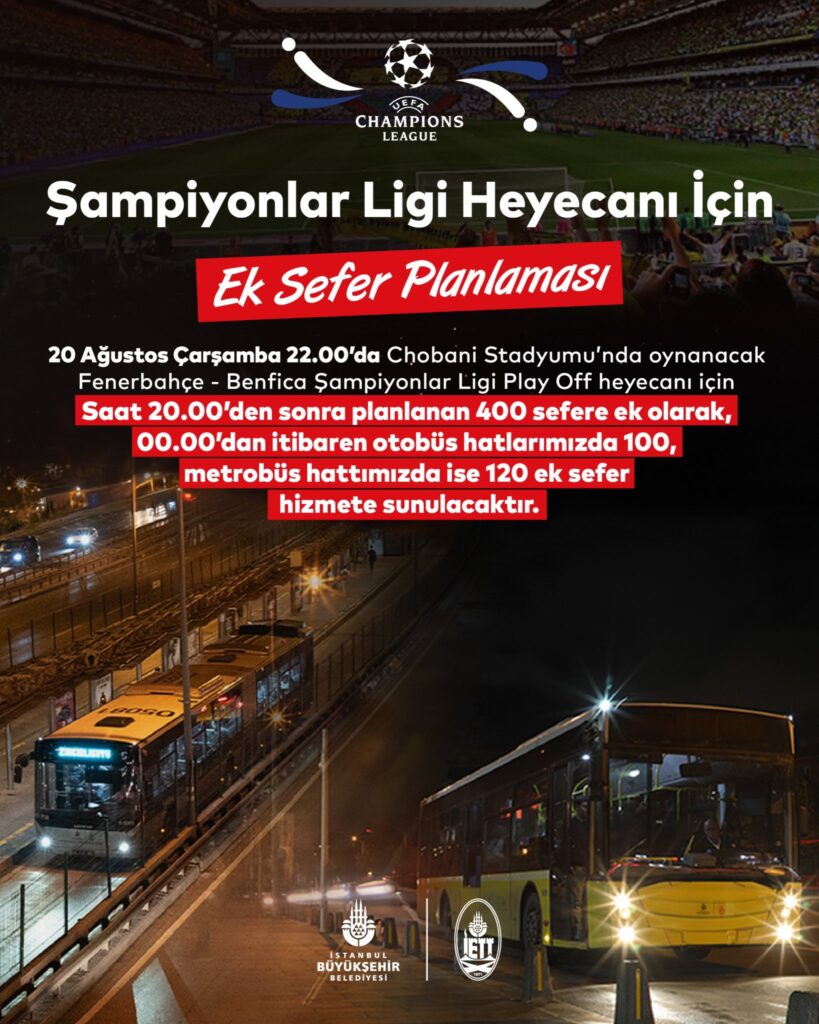 ⚽ 20 Ağustos Çarşamba akşamı saat 22.00’de Chobani Stadyumu’nda oynanacak Fenerbahçe – Benfica Şampiyonlar Ligi Play-Off karşılaşması öncesinde İstanbul’da ulaşım düzenlemeleri yapıldı.