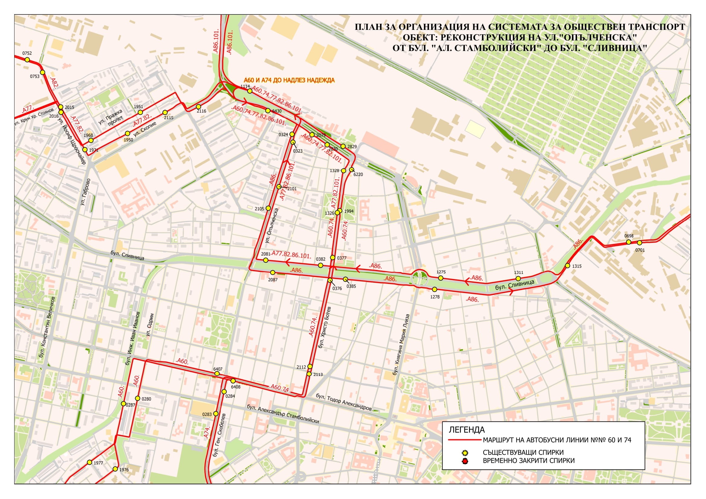 Автобусни линии № 77 и 82 се възстановяват по действащите маршрути: през ул. „Опълченска“ посока ж.к. „Западен парк“/ж.к. „Люлин-5“ съгласно приложената маршрутна схема.