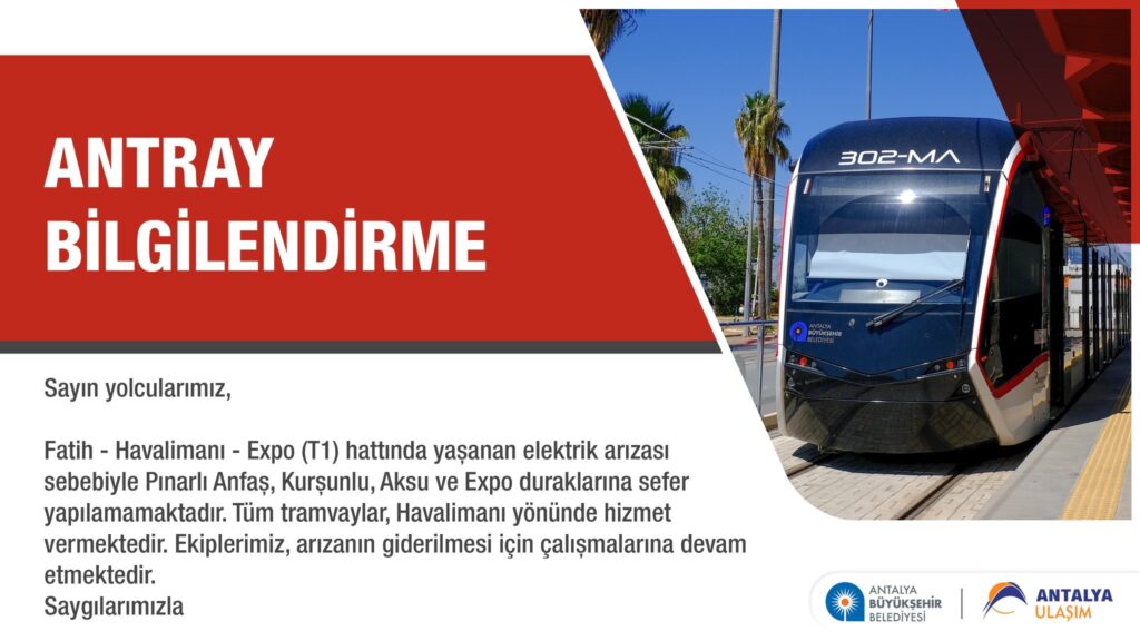 Arıza sebebiyle Pınarlı Anfaş, Kurşunlu, Aksu ve Expo duraklarında hizmet verilememektedir. Yetkililer, hattaki tüm tramvayların Havalimanı yönünde hizmet vermeye devam ettiğini bildirdi.